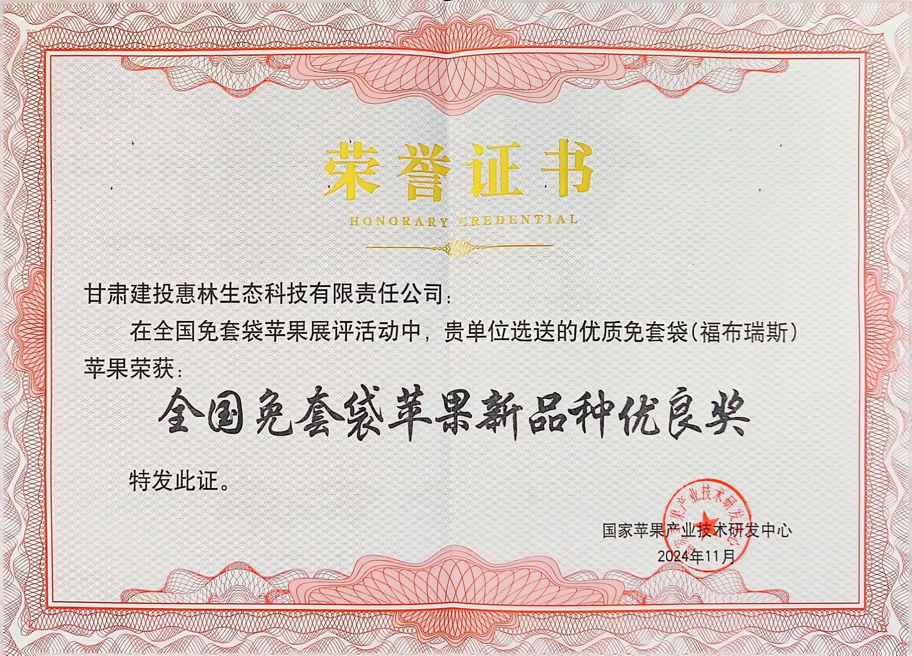 近日,全国苹果免套袋轻简化精准高效优质生产技术研讨培训会暨苹果免套袋栽培技术协作组工作交流会在山东省烟台市蓬莱区举办,由惠林公司选送的优质免套袋(福布瑞斯)苹果荣获“全国免套袋苹果新品种优良奖”。